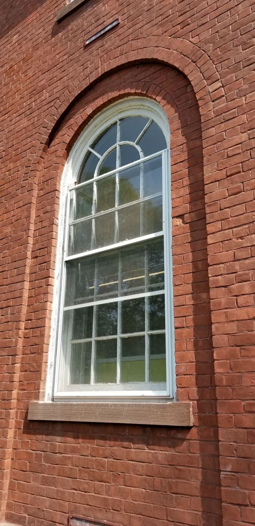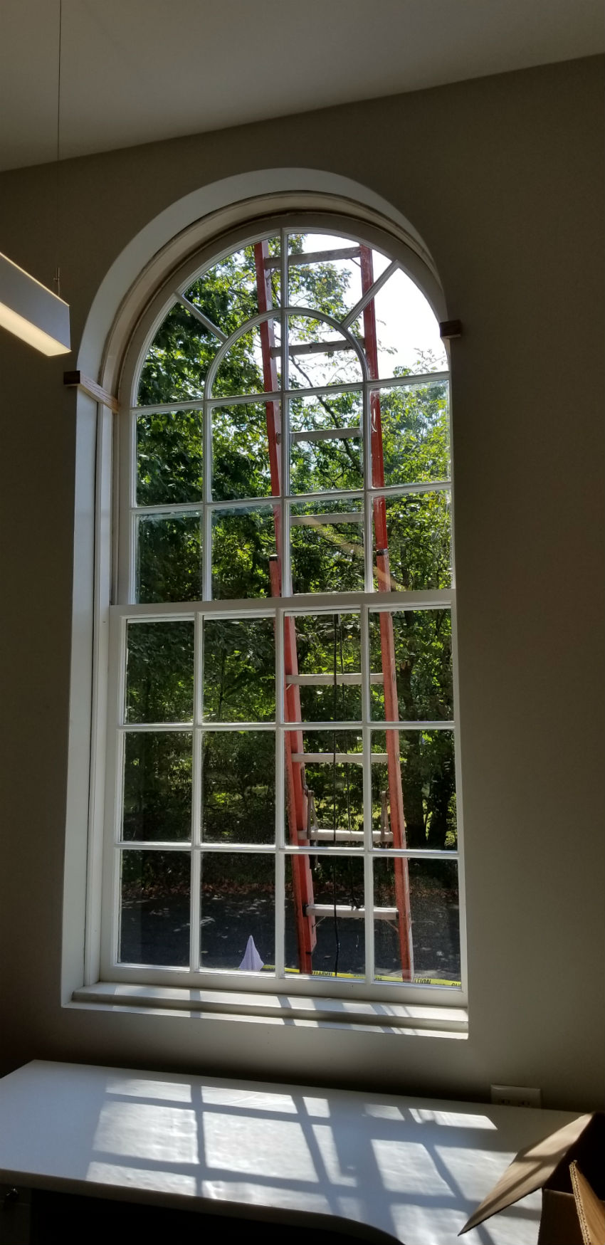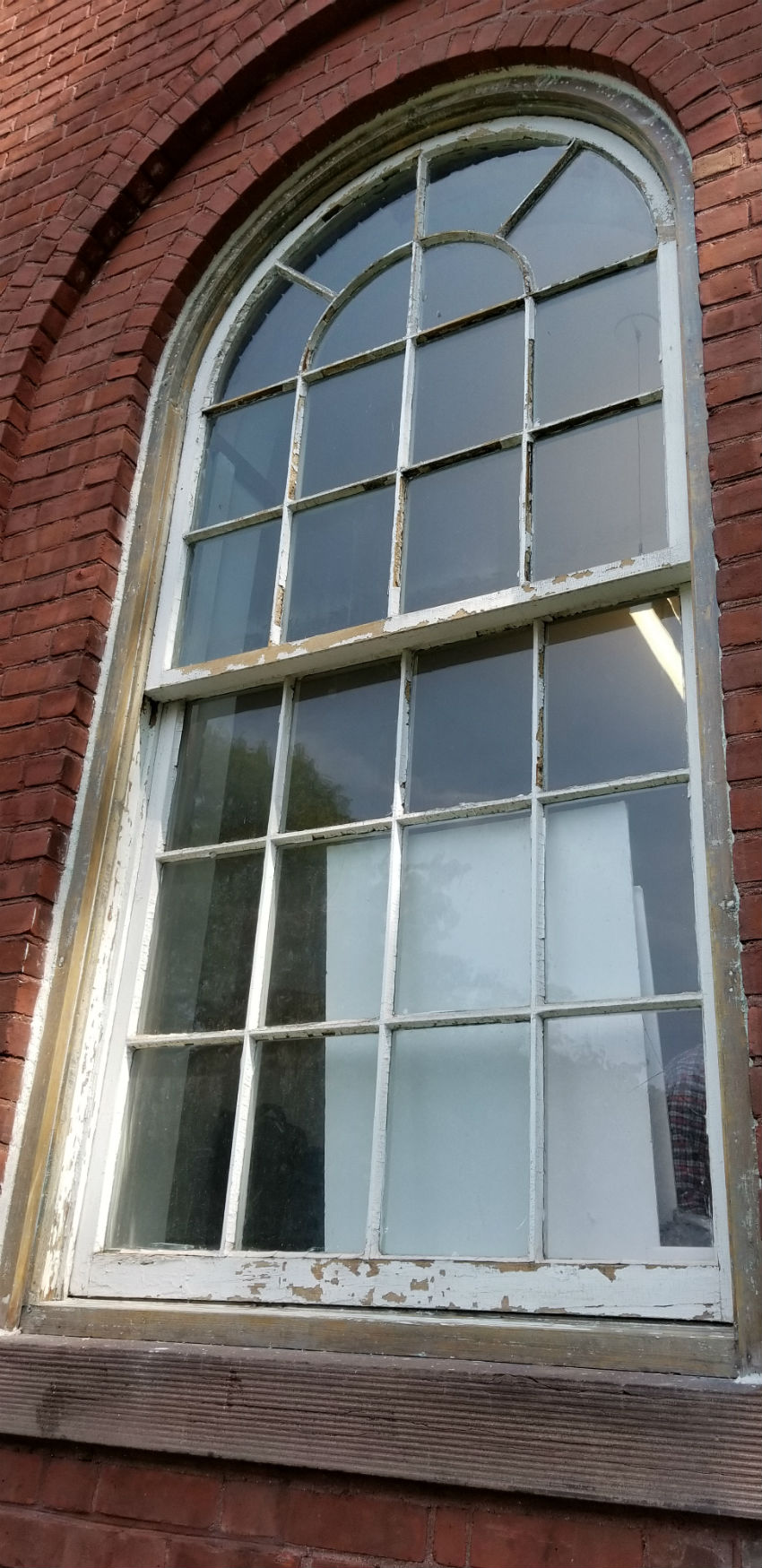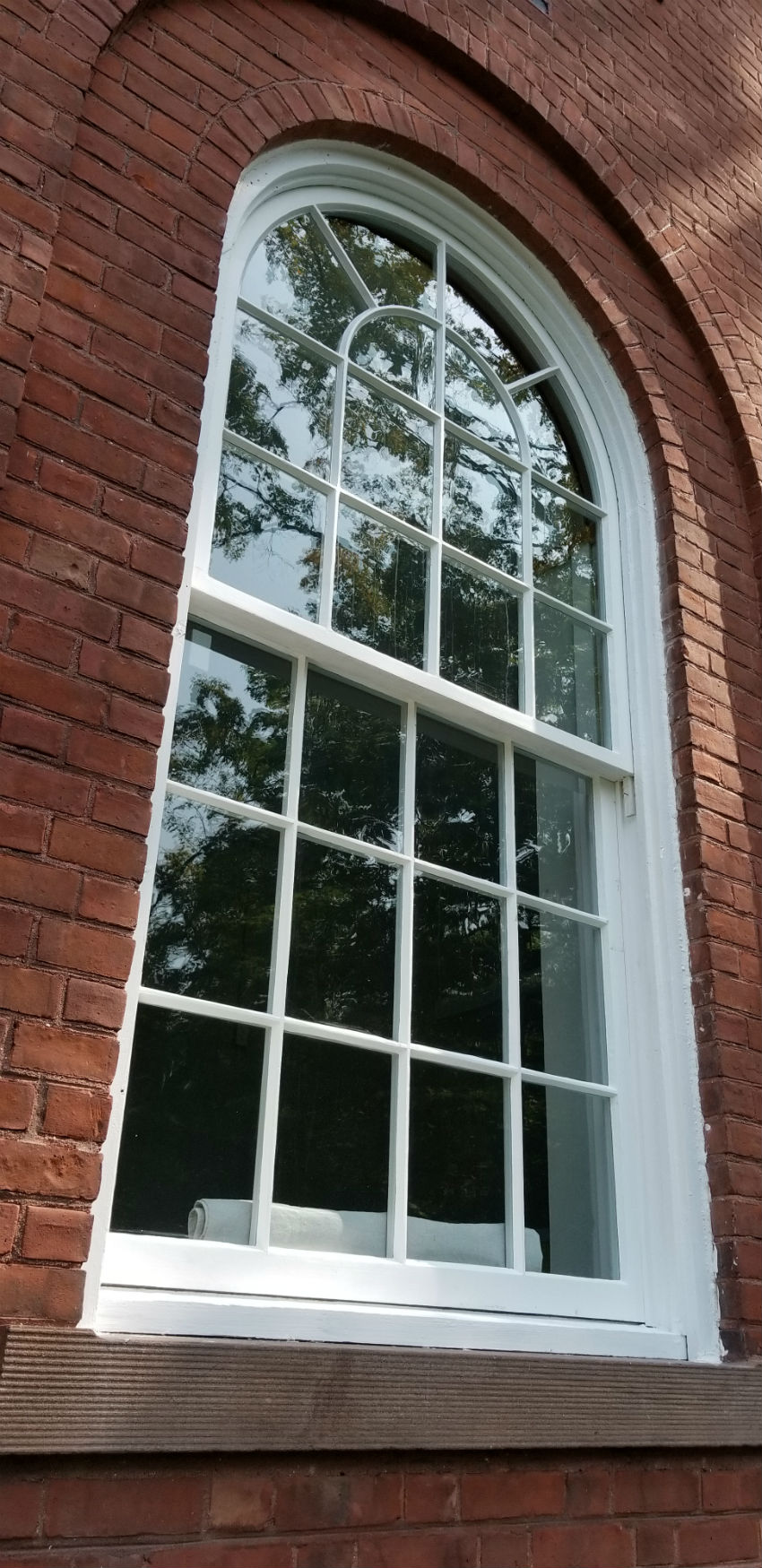 This job was a complete restoration of the sash for 18 round-top windows in this historic building, in addition to 28 others. Restoration comprised complete removal of paint, putty, and glass. We then did repairs as needed, using wood and epoxy, sanding, priming, and reinstalled the original glass in its respective locations, as all planes are not created equal. Top glazing was done with oil base putty, letting it dry for a week or so before applying final paint. To complete the installations, custom interior storm windows were fabricated to increase efficiency by as much as 30%.